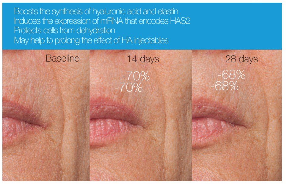 Зволожує завдяки низькомолекулярній гіалуроновій кислоті та покращує щільність тканин з перших тижнів застосування.