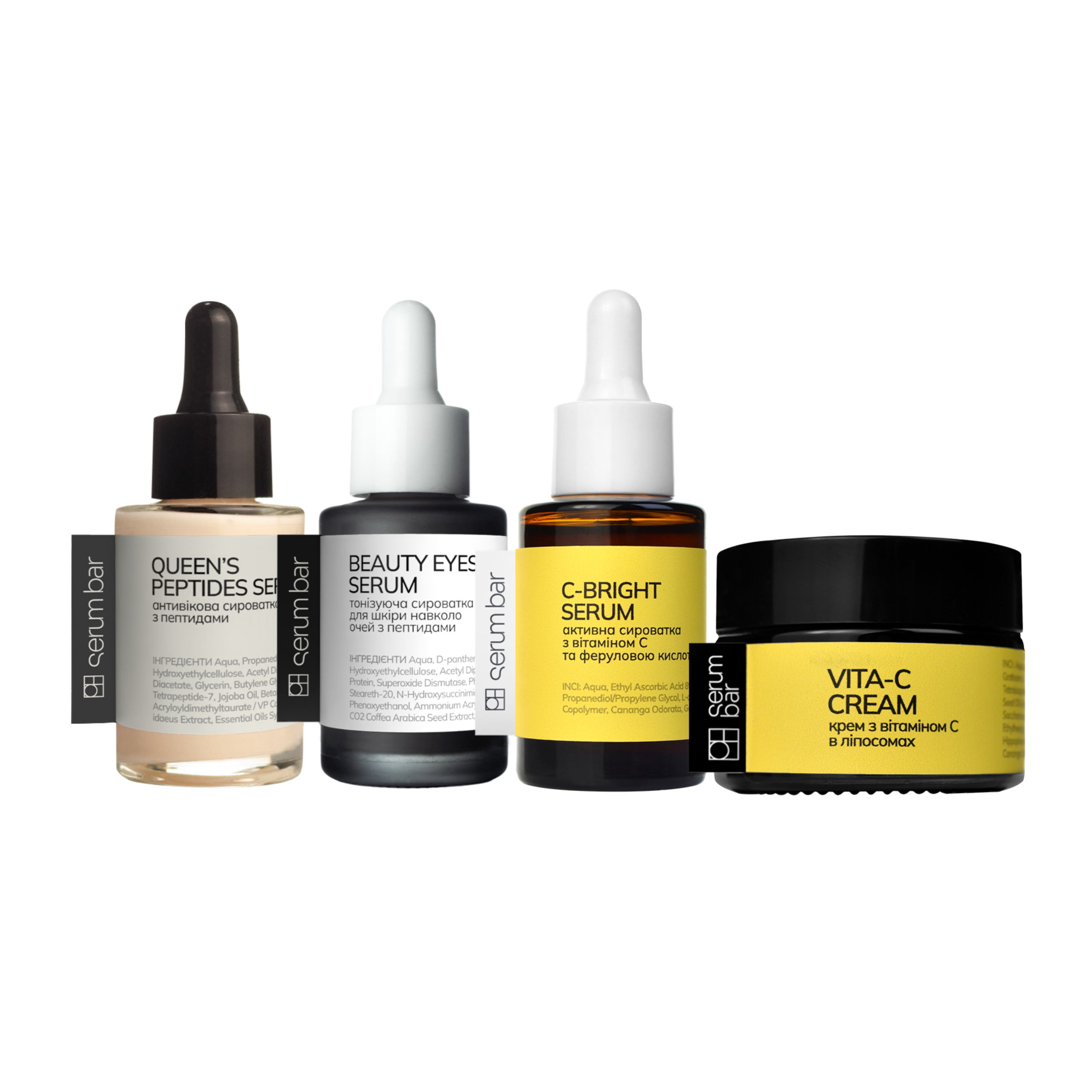Нанести по маленькій краплі на зону навколо очей Beauty Eyes Serum На обличчя сироватку C-bright За бажанням закрити кремом Vita C Обов’язково використовувати засіб з SPF перед виходом на вулицю (з квітня по жовтень)