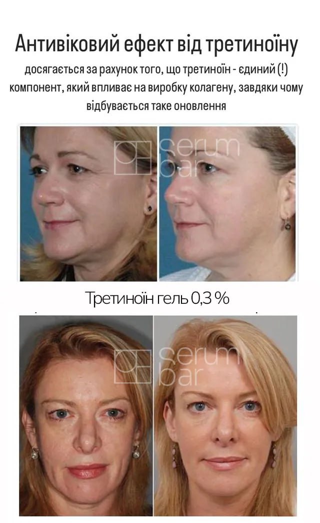 Третиноїн – це потужний ретиноїд, який діє в глибоких шарах шкіри та здатен значно змінити її стан. За потужністю порівнюється зі СМАС ліфтингом та професійними пілінгами.