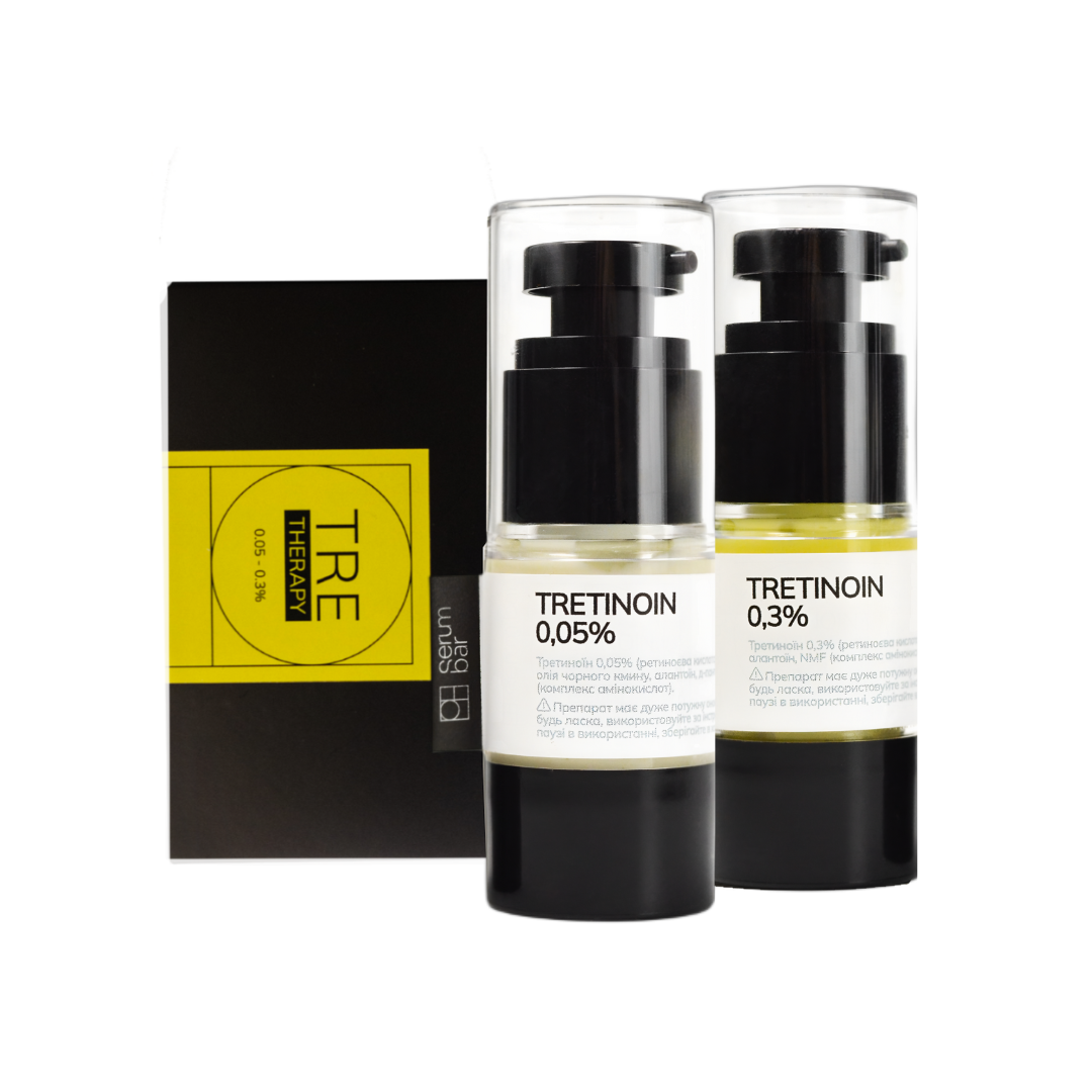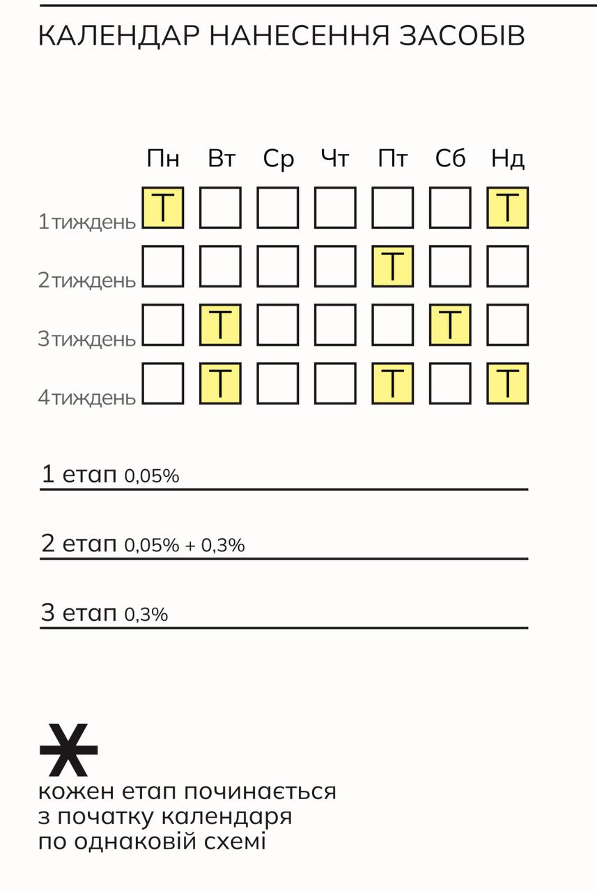 2 етап (Tretinoin 0.3) – третиноїн 0,3% (ретиноєва кислота), Д-пантенол, алантоїн, NMF (комплекс амінокислот).